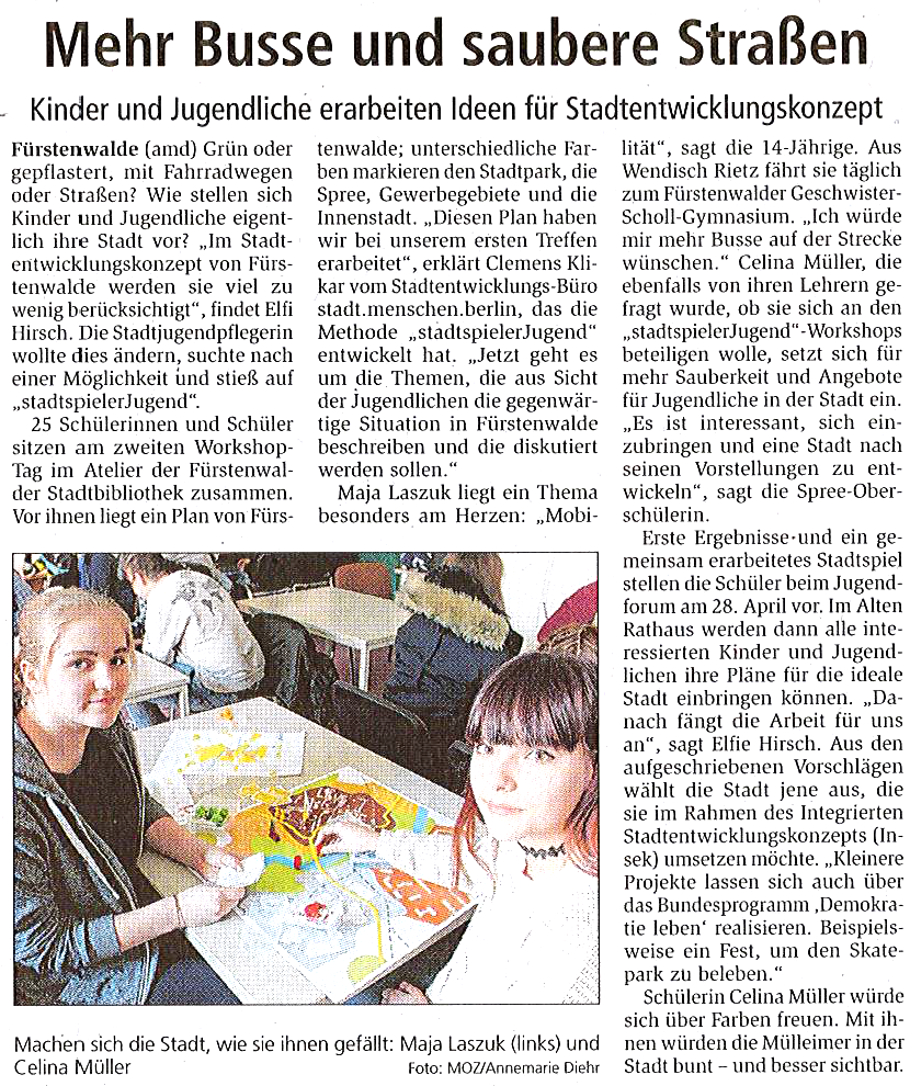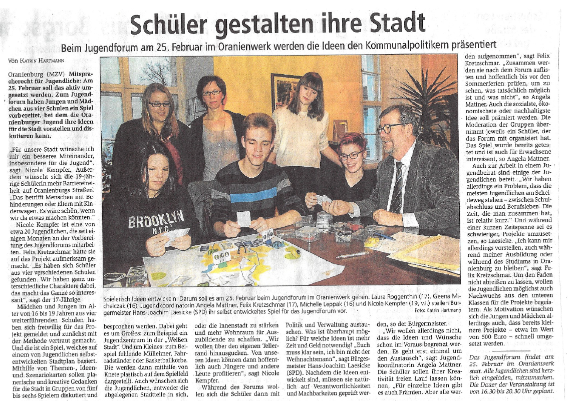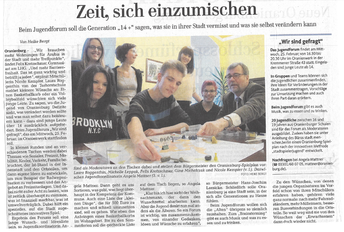 Aktivierung von Jugendlichen zur Entwicklung eines lokalen Beteiligungsinstrumentes und Durchführung eines Jugendforums, lokale Anpassung und Anwendung der Methode stadtspielerJUGEND / im Auftrag der Stadt Oranienburg / 2014 - 2015 /